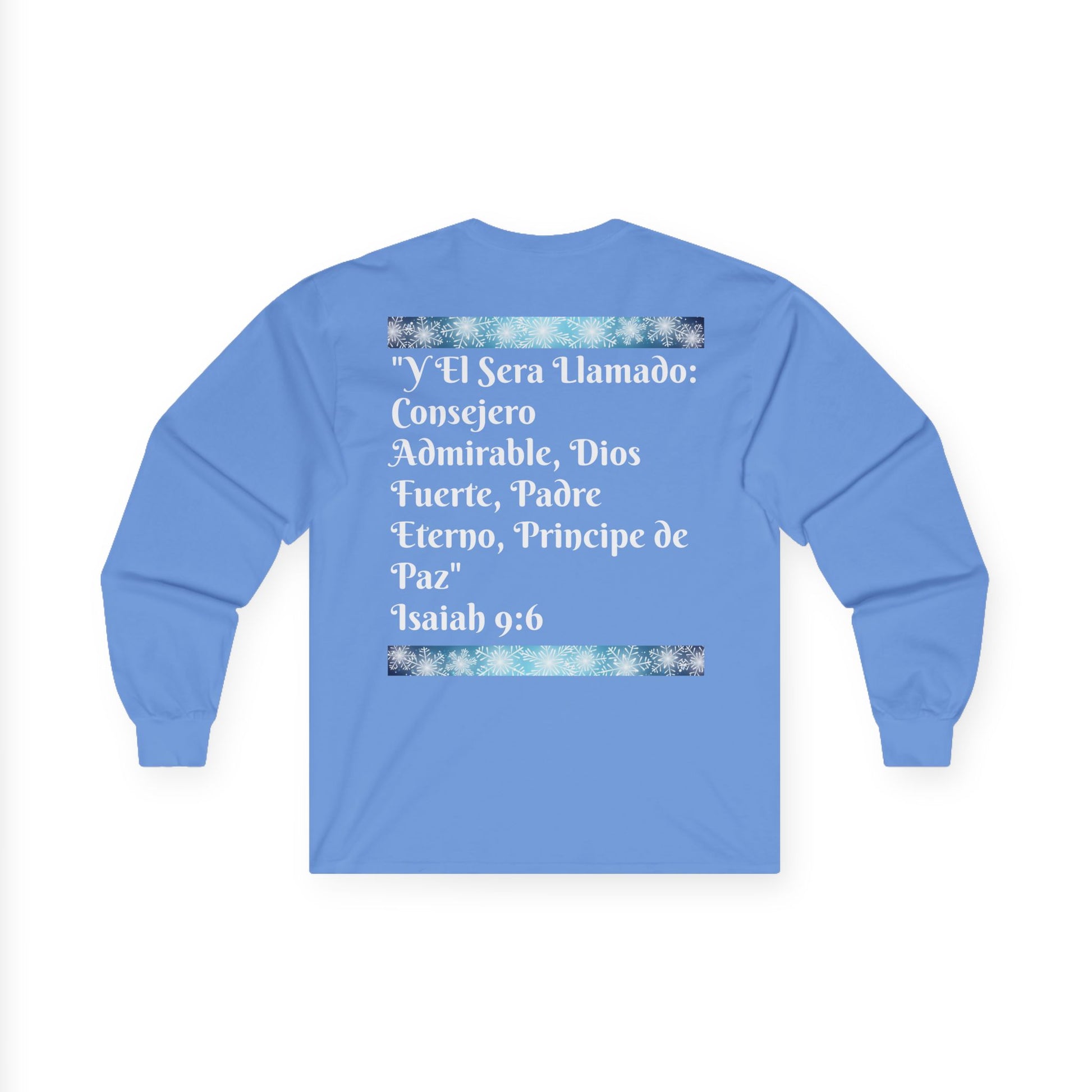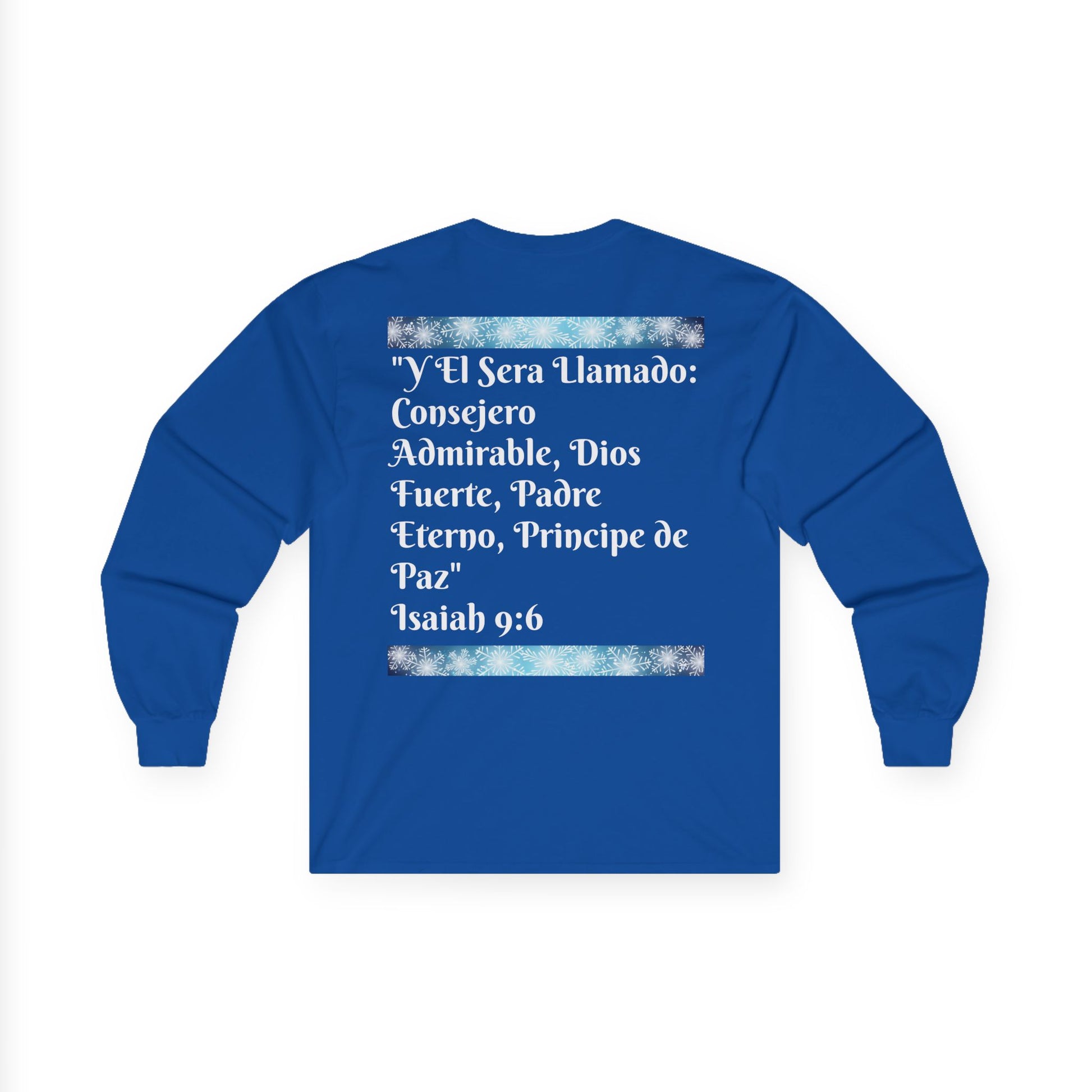 Feliz Navidad Long Sleeve Tee — Spanish Christmas Isaiah 9:6 on The Back Holiday Shirt