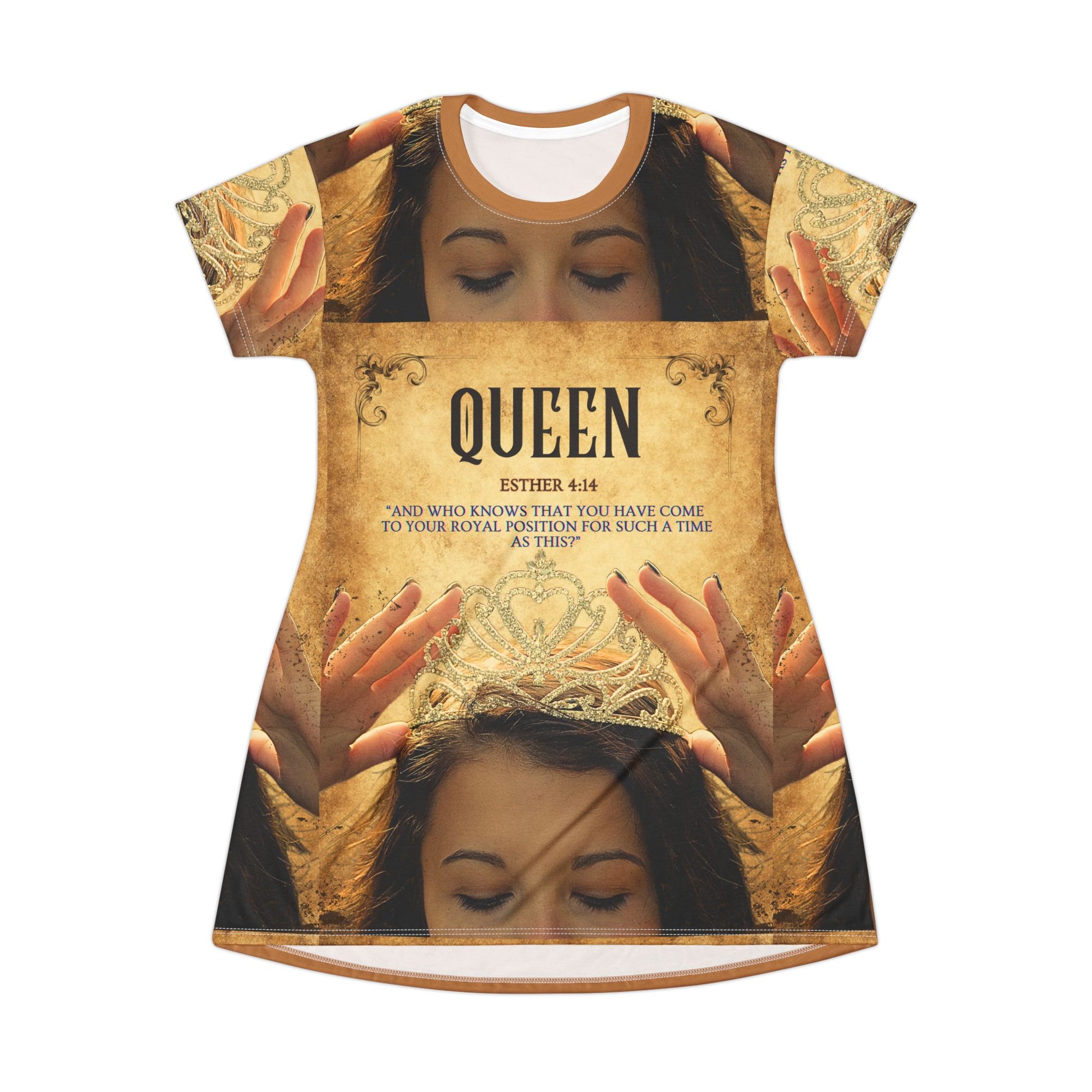 Inspired by Queen Esther, this T-Shirt Dress features a powerful Bible verse, Esther 4:14, "And Who Knows But That You Have Come To Your Royal Position For Such A Time As This?" The regal long shirt/dress has a royal crown, Queen design, giving off royalty and confident vibes. Perfect for those who appreciate Biblical inspiration and want to make a statement. Ideal for religious holidays, events or just standing out running weekend errands. Fix Your Crown and Take Your Position!