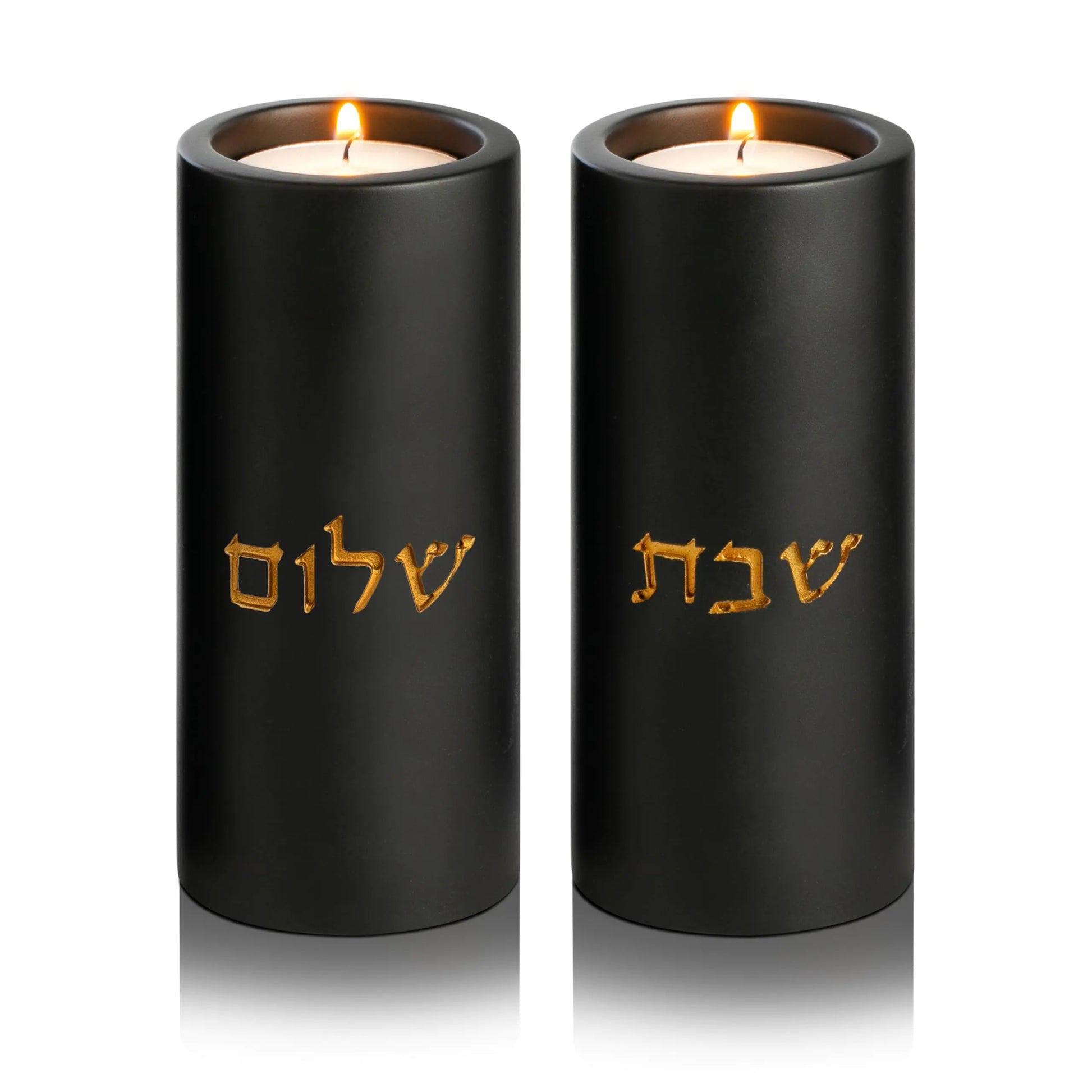SURI Black Concrete Shabbat Candle Holder Set with Gold Writing | Modern Judaica Gift